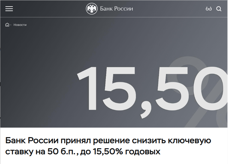 "Банк России принял решение снизить ключевую ставку на 50 б.п., до 15,50% годовых".