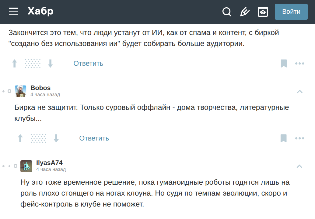 "Закончится это тем, что люди устанут от ИИ, как от спама и контент, с биркой "создано без использования ии" будет собирать больше аудитории.