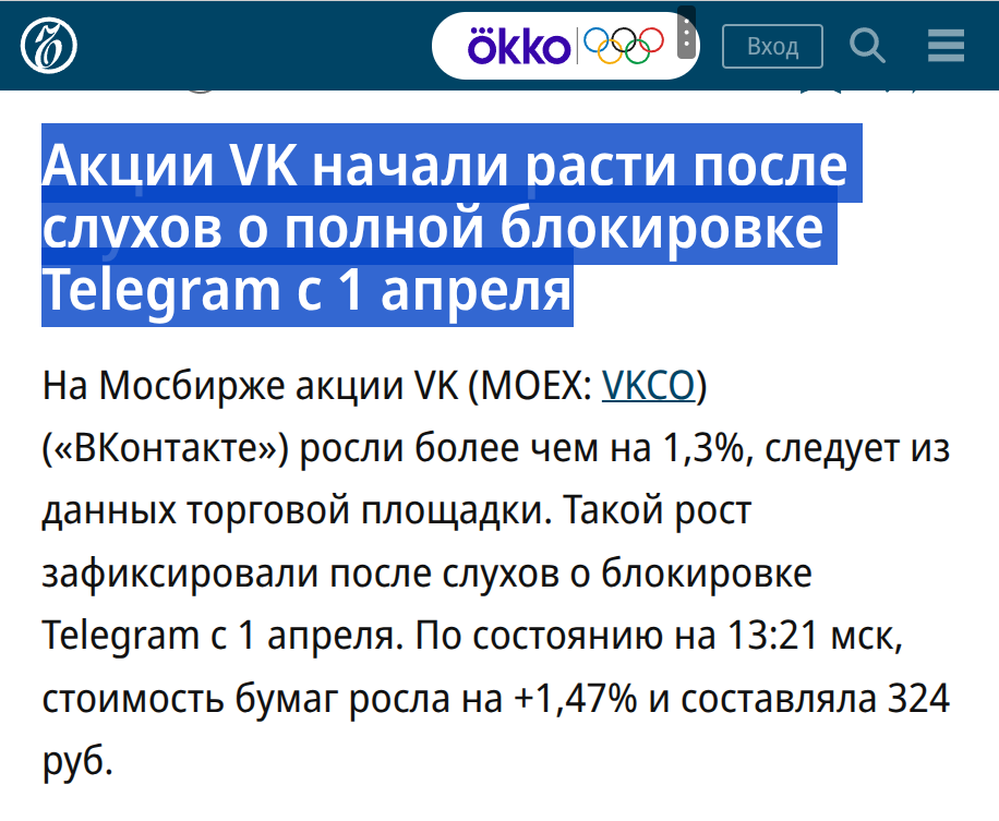 "Акции VK начали расти после слухов о полной блокировке Telegram с 1 апреля".
