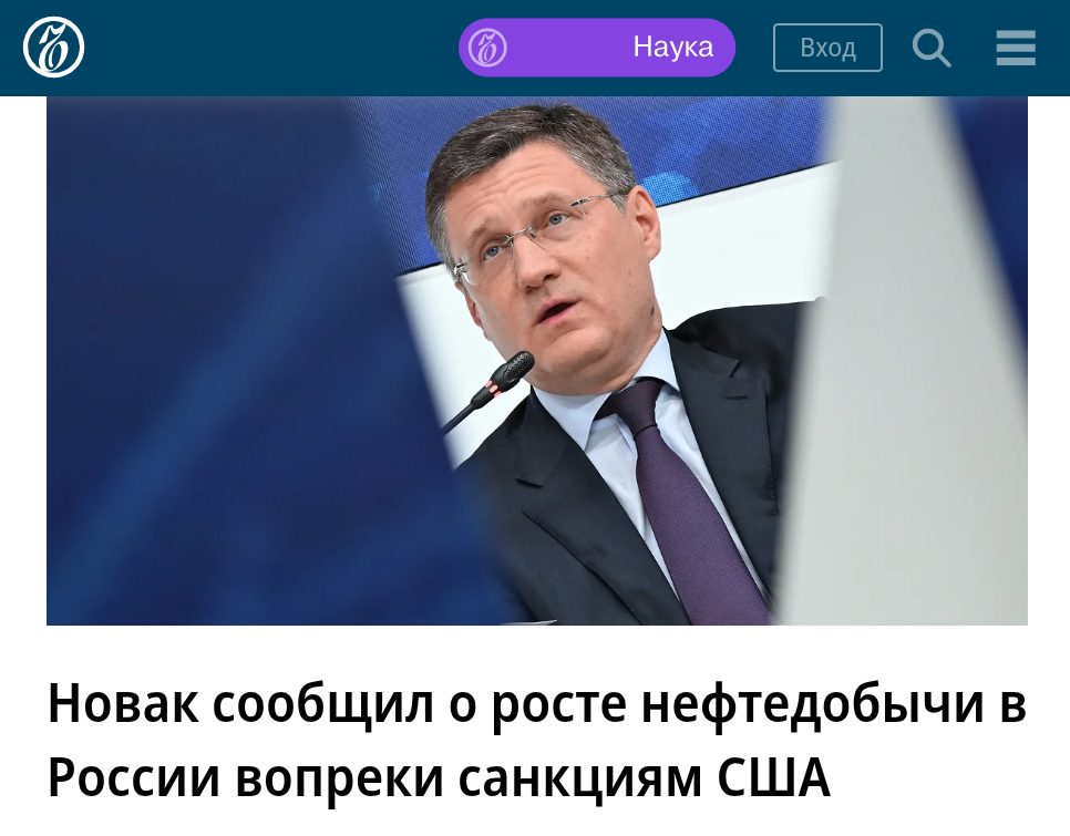 "Санкции стран Запада не повлияли на добычу нефти в России, она растет, заявил вице-премьер Александр Новак.