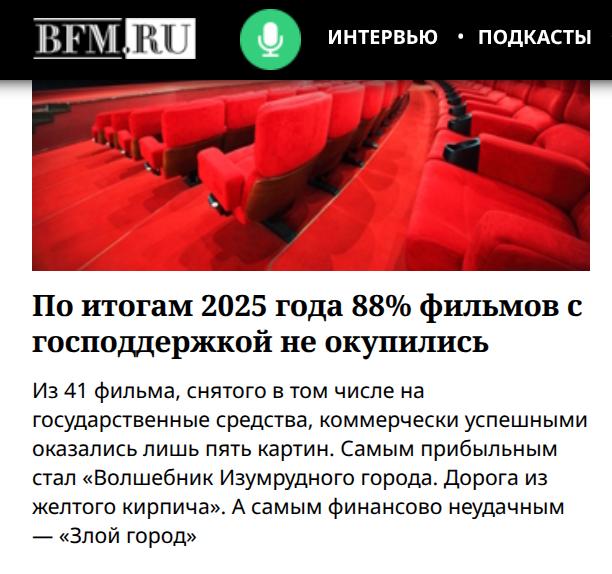 "По итогам 2025 года 88% фильмов с господдержкой не окупились".
