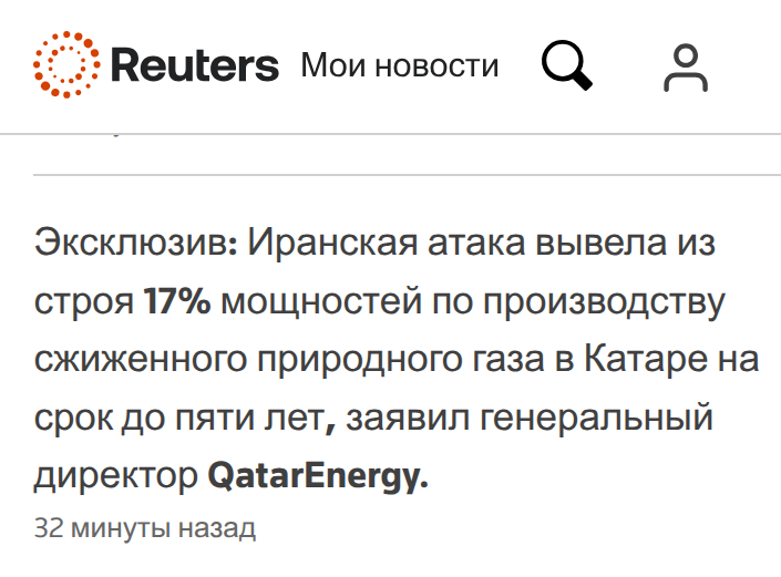 "Эксклюзив: Иранская атака вывела из строя 17% мощностей по производству сжиженного природного газа в Катаре на срок до пяти лет, заявил генеральный директор QatarEnergy".