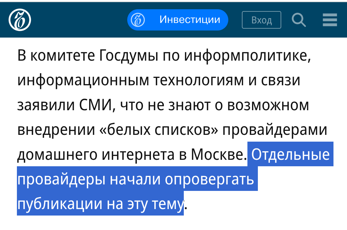 "В комитете Госдумы по информполитике, информационным технологиям и связи заявили СМИ, что не знают о возможном внедрении «белых списков» провайдерами домашнего интернета в Москве.