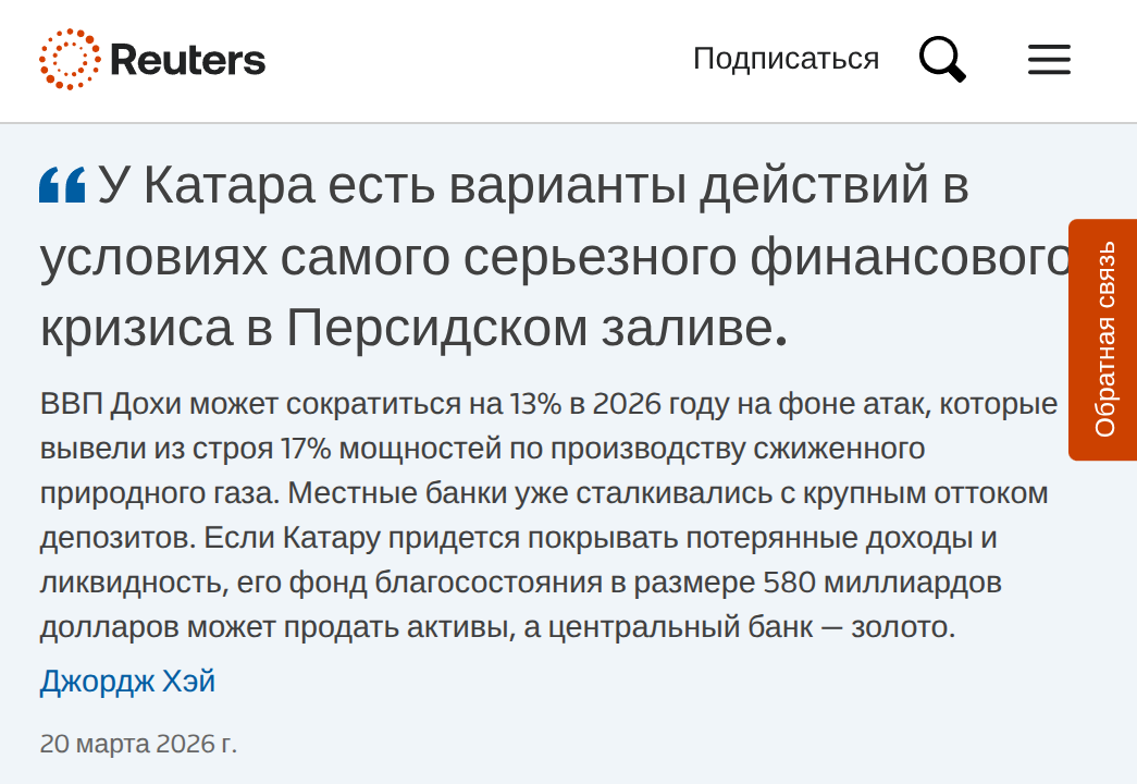"ВВП Дохи может сократиться на 13% в 2026 году на фоне атак, которые вывели из строя 17% мощностей по производству сжиженного природного газа".