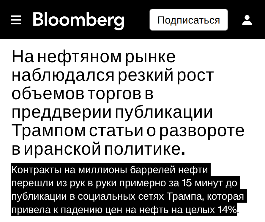 Контракты на миллионы баррелей нефти перешли из рук в руки примерно за 15 минут до публикации в социальных сетях Трампа, которая привела к падению цен на нефть на целых 14%".