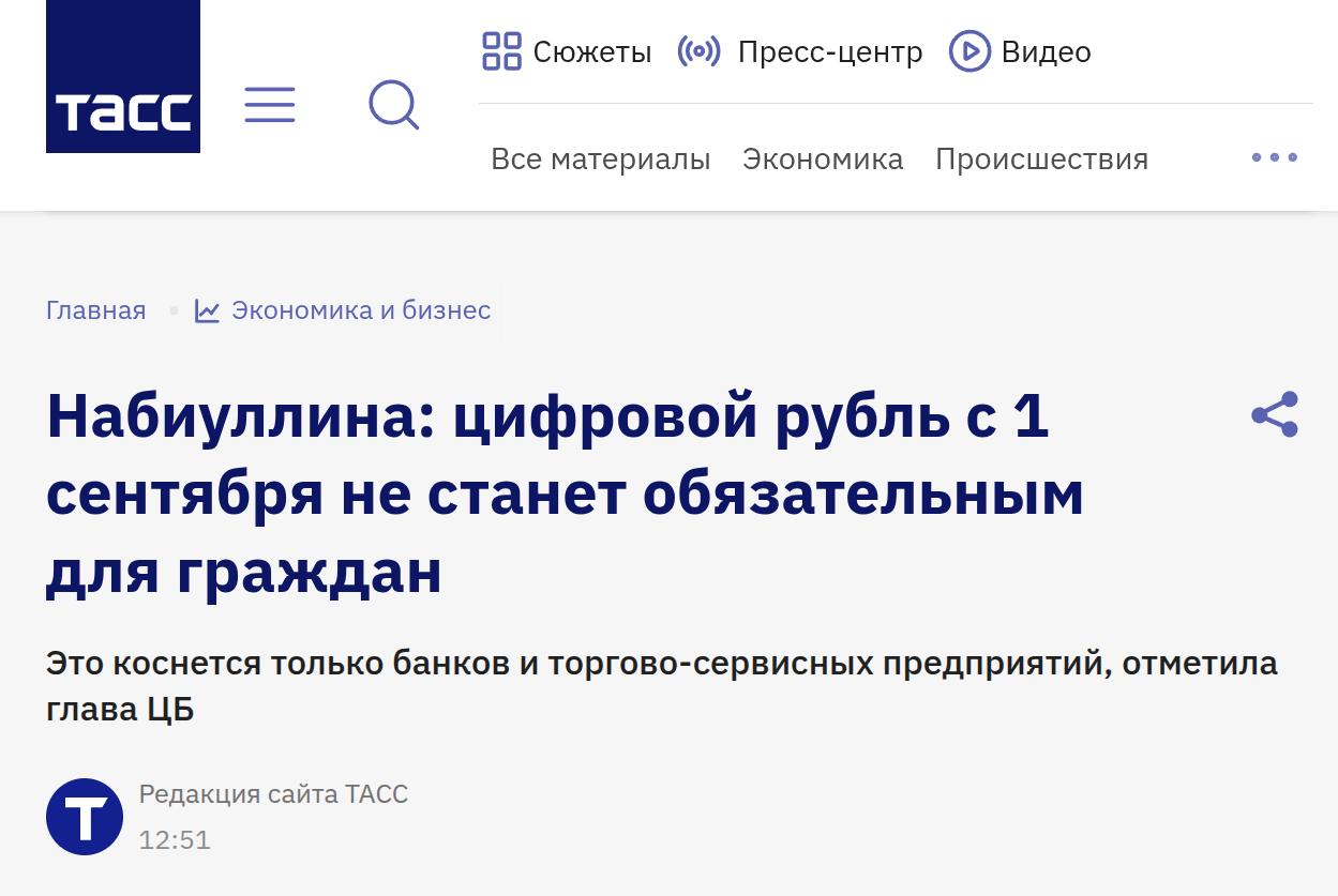 "Набиуллина: цифровой рубль с 1 сентября не станет обязательным для граждан.