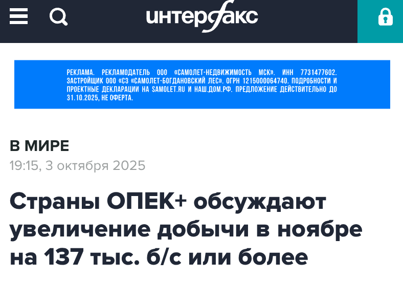 "Москва. 3 октября. INTERFAX.RU - Страны ОПЕК+ пытаются достичь консенсуса о том, как скорректировать добычу нефти в следующем месяце, с возможным как умеренным, так и более существенным увеличением предложения, пишет агентство Bloomberg со ссылкой на неназванных делегатов".