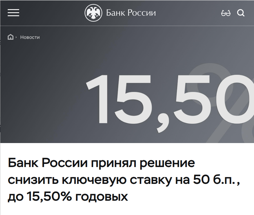 "Банк России принял решение снизить ключевую ставку на 50 б.п., до 15,50% годовых".
