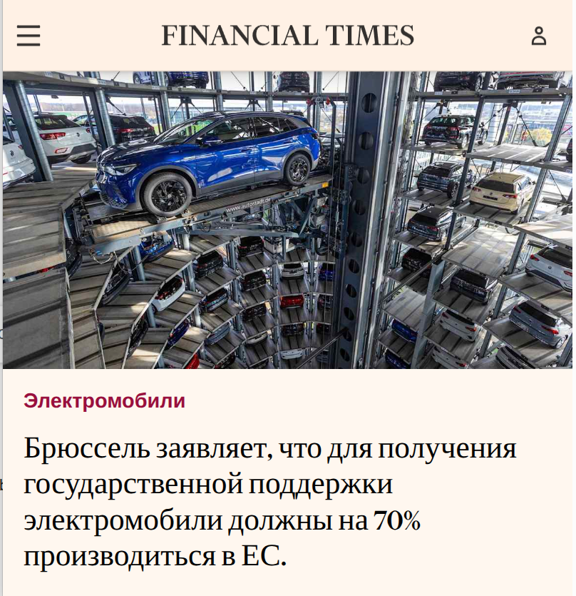 "Брюссель заявляет, что для получения государственной поддержки электромобили должны на 70% производиться в ЕС".