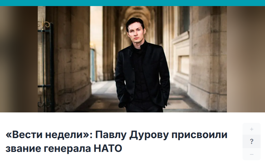 Журналист Дмитрий Киселёв заявил в программе «Вести недели», что генеральный секретарь НАТО Марк Рютте тайно подписал указ о присвоении Павлу Дурову «за успехи в боевой и политической подготовке» внеочередного воинского звания генерала Североатлантического альянса.