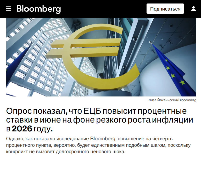 "Опрос показал, что ЕЦБ повысит процентные ставки в июне на фоне резкого роста инфляции в 2026 году.