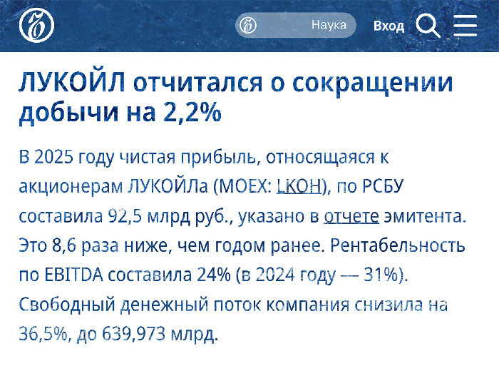 "ЛУКОЙЛ отчитался о сокращении добычи на 2,2%".