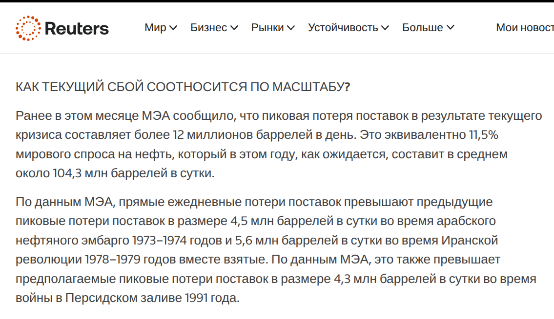 "Ранее в этом месяце МЭА сообщило, что пиковая потеря поставок в результате текущего кризиса составляет более 12 миллионов баррелей в день. Это эквивалентно 11,5% мирового спроса на нефть, который в этом году, как ожидается, составит в среднем около 104,3 млн баррелей в сутки.