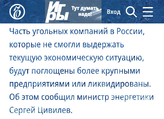 "Часть угольных компаний в России, которые не смогли выдержать текущую экономическую ситуацию, будут поглощены более крупными предприятиями или ликвидированы. Об этом сообщил министр энергетики Сергей Цивилев".