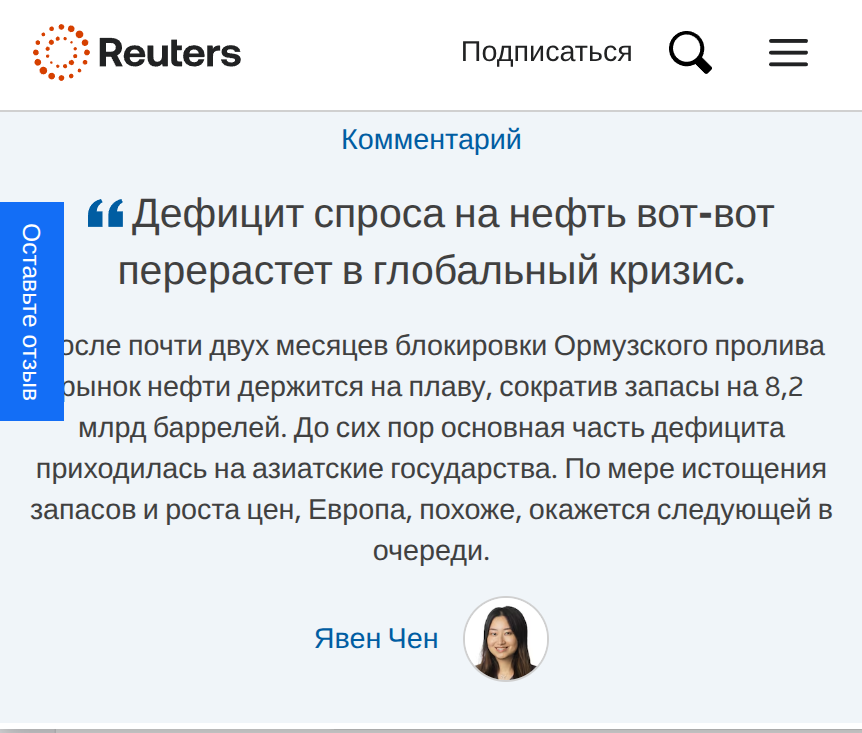 "Ранее в этом месяце МЭА сообщило, что пиковая потеря поставок в результате текущего кризиса составляет более 12 миллионов баррелей в день. Это эквивалентно 11,5% мирового спроса на нефть, который в этом году, как ожидается, составит в среднем около 104,3 млн баррелей в сутки.