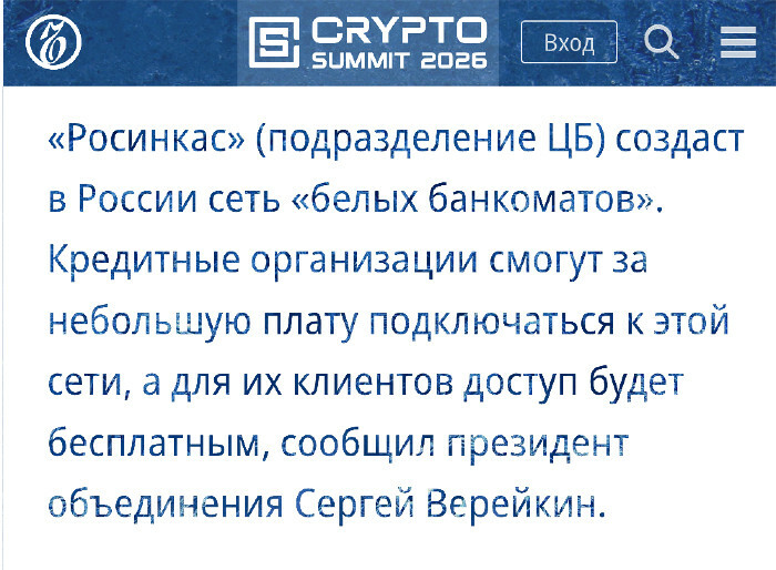 "«Росинкас» (подразделение ЦБ) создаст в России сеть «белых банкоматов». Кредитные организации смогут за небольшую плату подключаться к этой сети, а для их клиентов доступ будет бесплатным, сообщил президент объединения Сергей Верейкин".