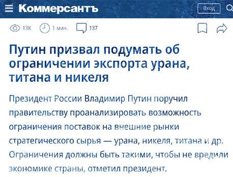 "Путин призвал подумать об ограничении экспорта урана, титана и никеля".