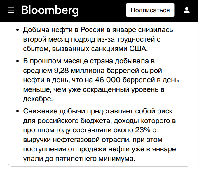 "Добыча нефти в России в январе снизилась второй месяц подряд из-за трудностей с сбытом, вызванных санкциями США.