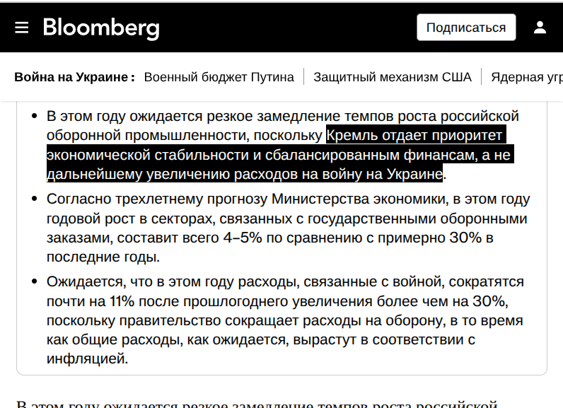 "Кремль отдает приоритет экономической стабильности и сбалансированным финансам, а не дальнейшему увеличению расходов на войну на Украине".