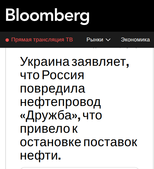 "Украина заявляет, что Россия повредила нефтепровод «Дружба», что привело к остановке поставок нефти".