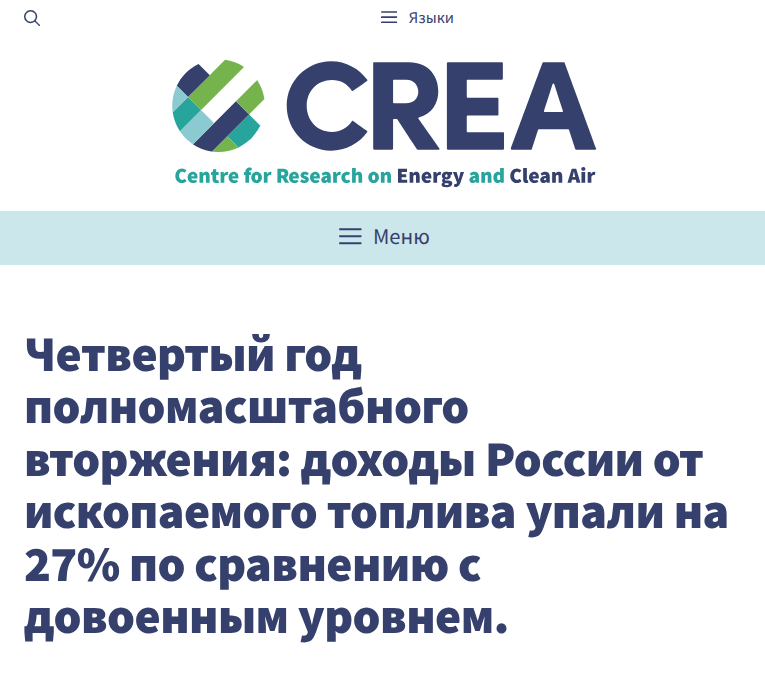"Четвертый год полномасштабного вторжения: доходы России от ископаемого топлива упали на 27% по сравнению с довоенным уровнем".