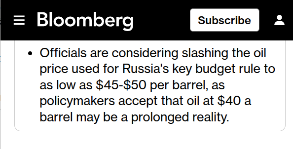 "Чиновники рассматривают возможность снижения цены на нефть, используемой в ключевом бюджетном правиле России, до 45-50 долларов за баррель, поскольку политики признают, что нефть по цене 40 долларов за баррель может стать долгосрочной реальностью."