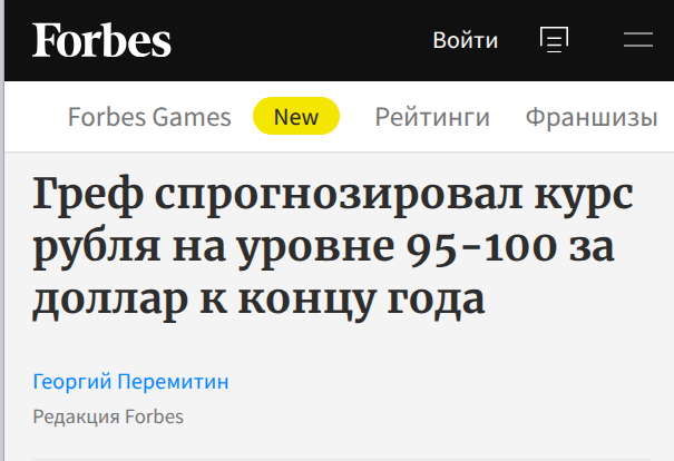 "При ожидаемых показателях платежного баланса и предстоящем снижении цены отсечения нефти по бюджетному правилу нет «ни одного шанса иметь такой крепкий рубль», считает глава «Сбера» Герман Греф".
