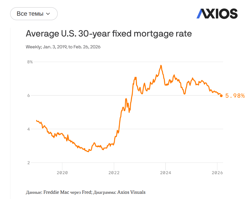 "Ставка 30 летним по ипотечным кредитам с фиксированной ставкой впервые с 2022 года опустилась ниже 6%".