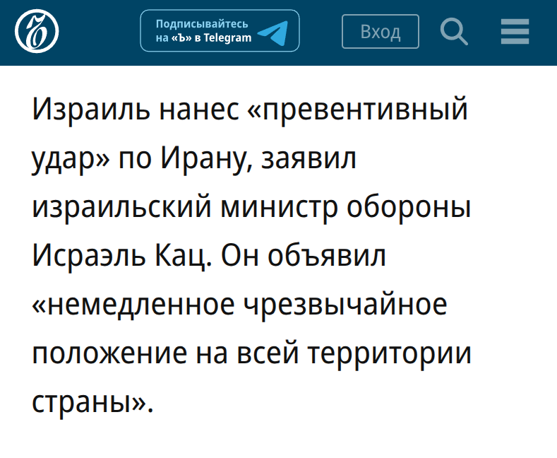 "Израиль нанес «превентивный удар» по Ирану, заявил израильский министр обороны Исраэль Кац.