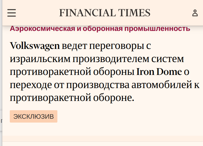 "Volkswagen ведет переговоры с израильским производителем систем противоракетной обороны Iron Dome о переходе от производства автомобилей к противоракетной обороне".