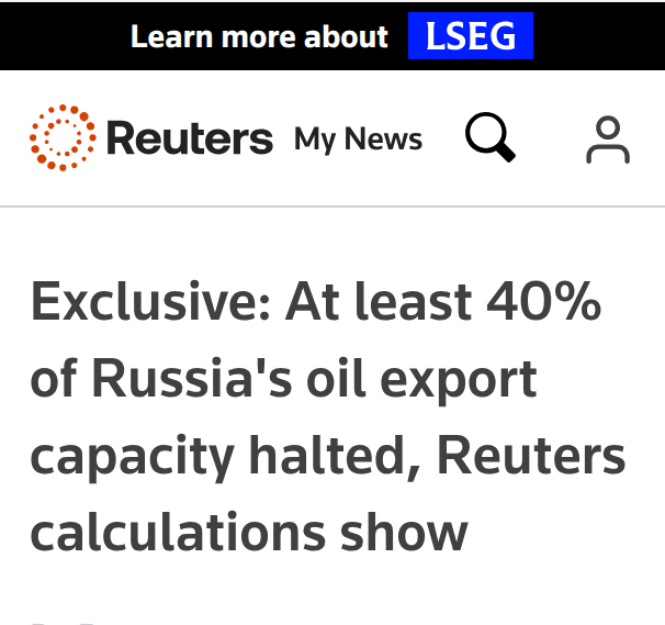 "По расчетам Reuters, приостановлено не менее 40% экспортных мощностей России по добыче нефти."
