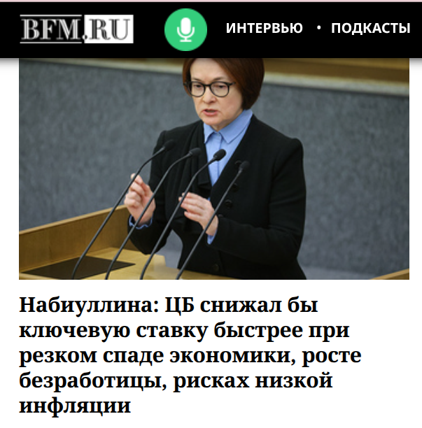 "Набиуллина: ЦБ снижал бы ключевую ставку быстрее при резком спаде экономики, росте безработицы, рисках низкой инфляции".
