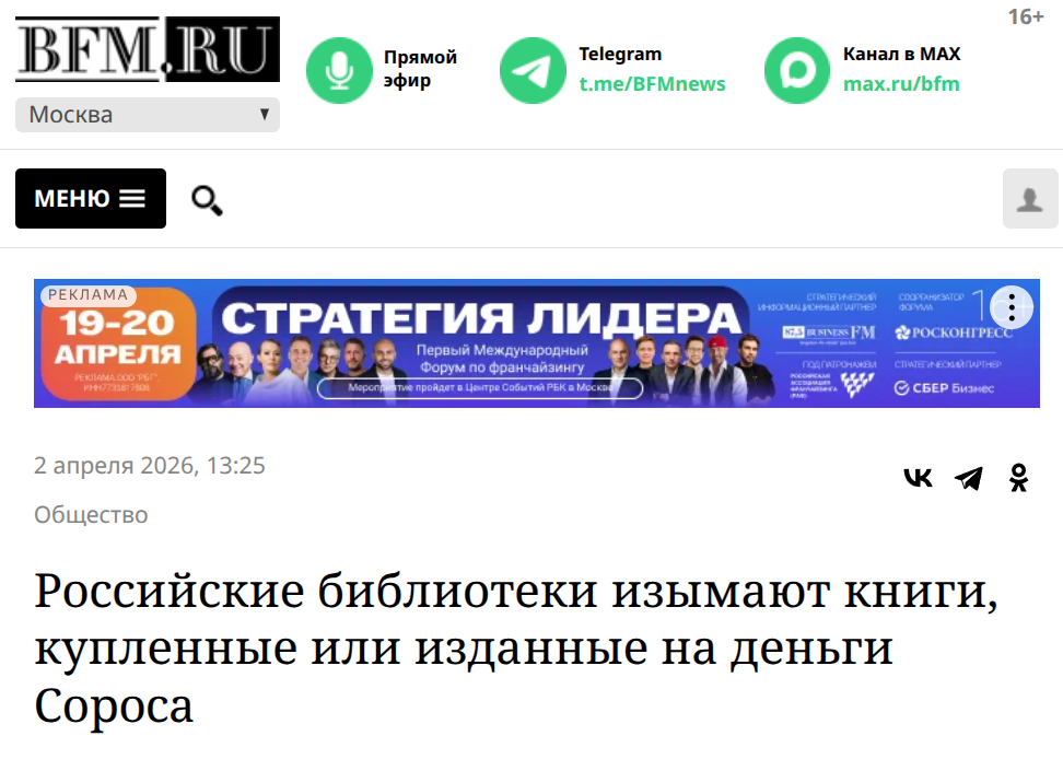 "Российские библиотеки изымают книги, купленные или изданные на деньги Сороса.