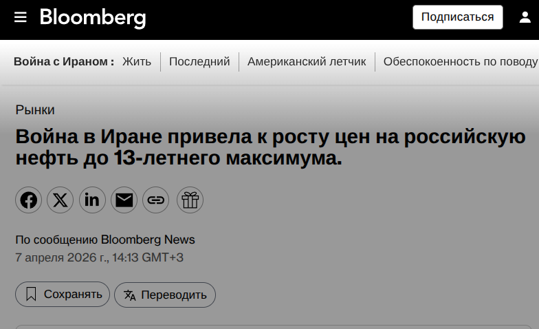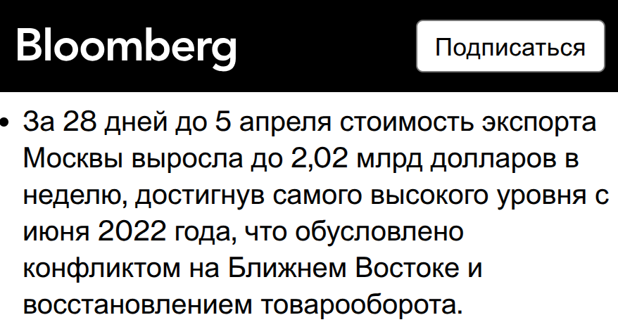 "За 28 дней до 5 апреля стоимость экспорта Москвы выросла до 2,02 млрд долларов в неделю, достигнув самого высокого уровня с июня 2022 года, что обусловлено конфликтом на Ближнем Востоке и восстановлением товарооборота".