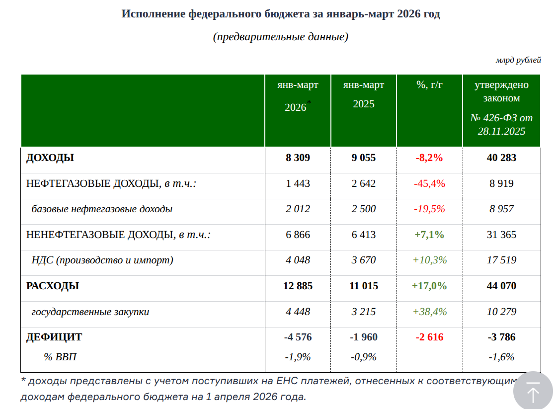 "По предварительной оценке, объем доходов федерального бюджета в январе-марте 2026 года составил 8 309 млрд рублей2, что на 8,2% ниже объема поступления доходов в соответствующем периоде 2025 года.
