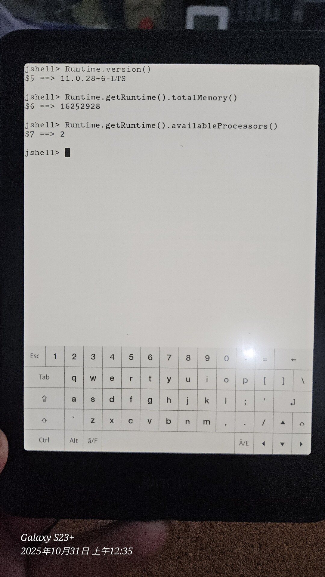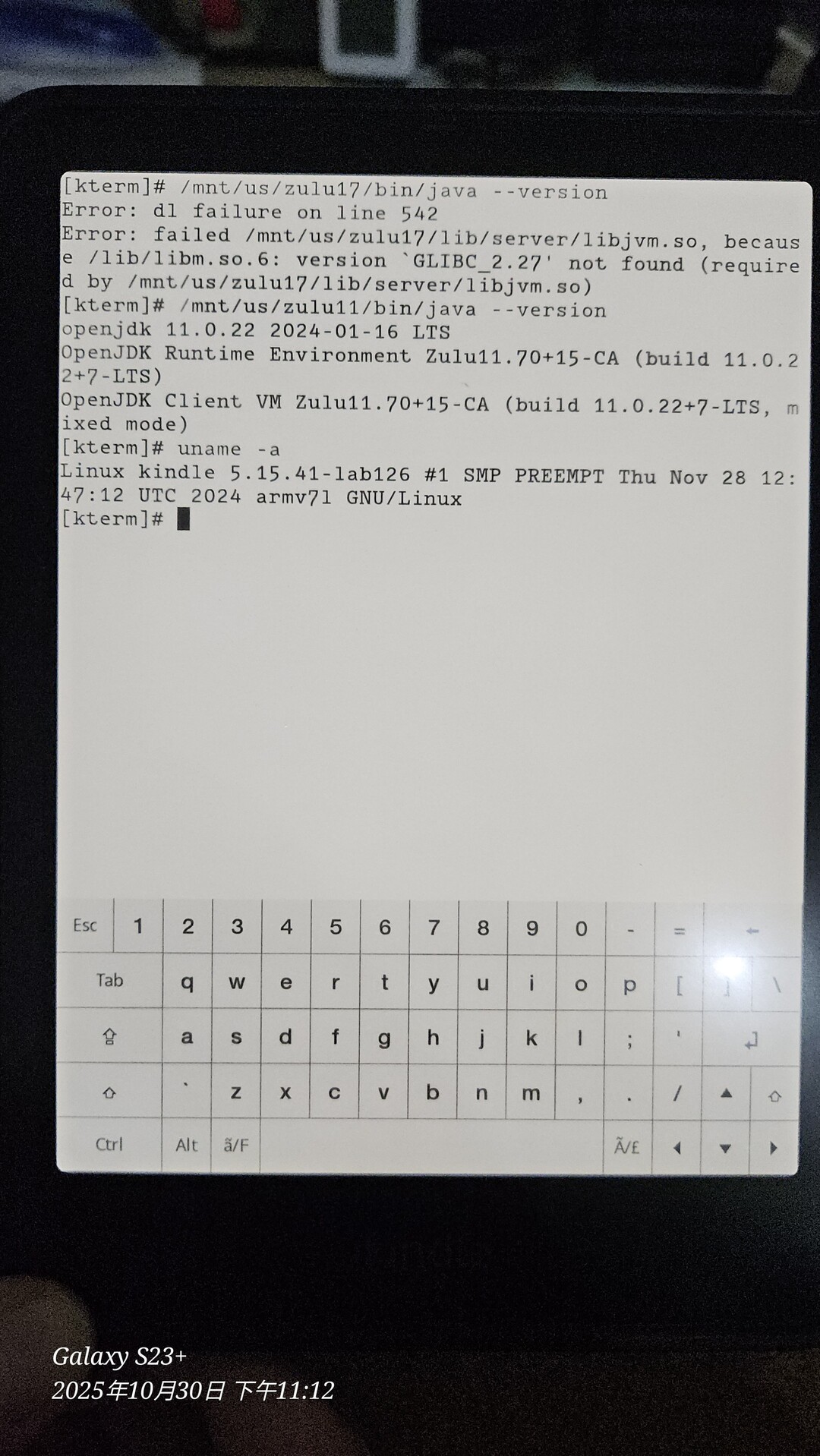 Tried jvm on kindle. Jdk17 isn't working, it requires glibc 2.27, while the kindle os only have 2.18. However, jdk11 works, at least it prints the version.