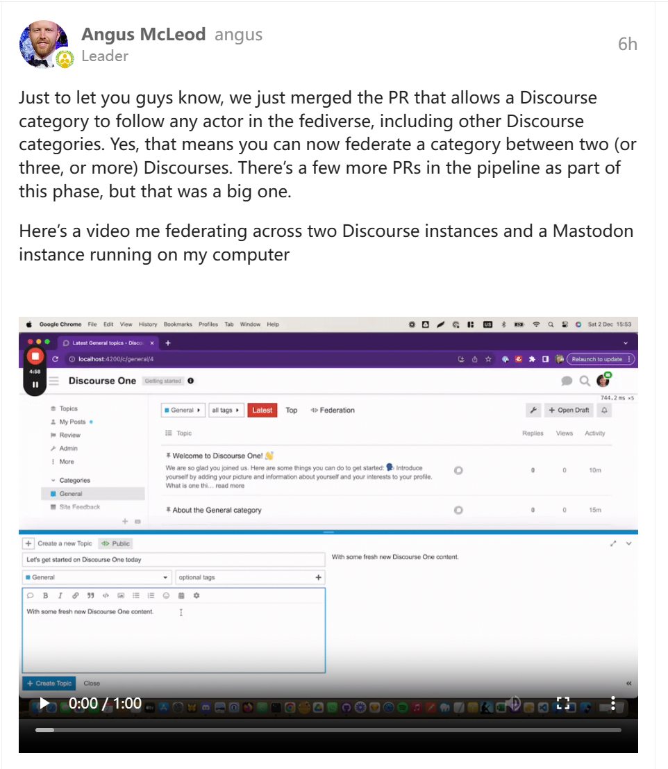Here’s a video me federating across two Discourse instances and a Mastodon instance running on my computer