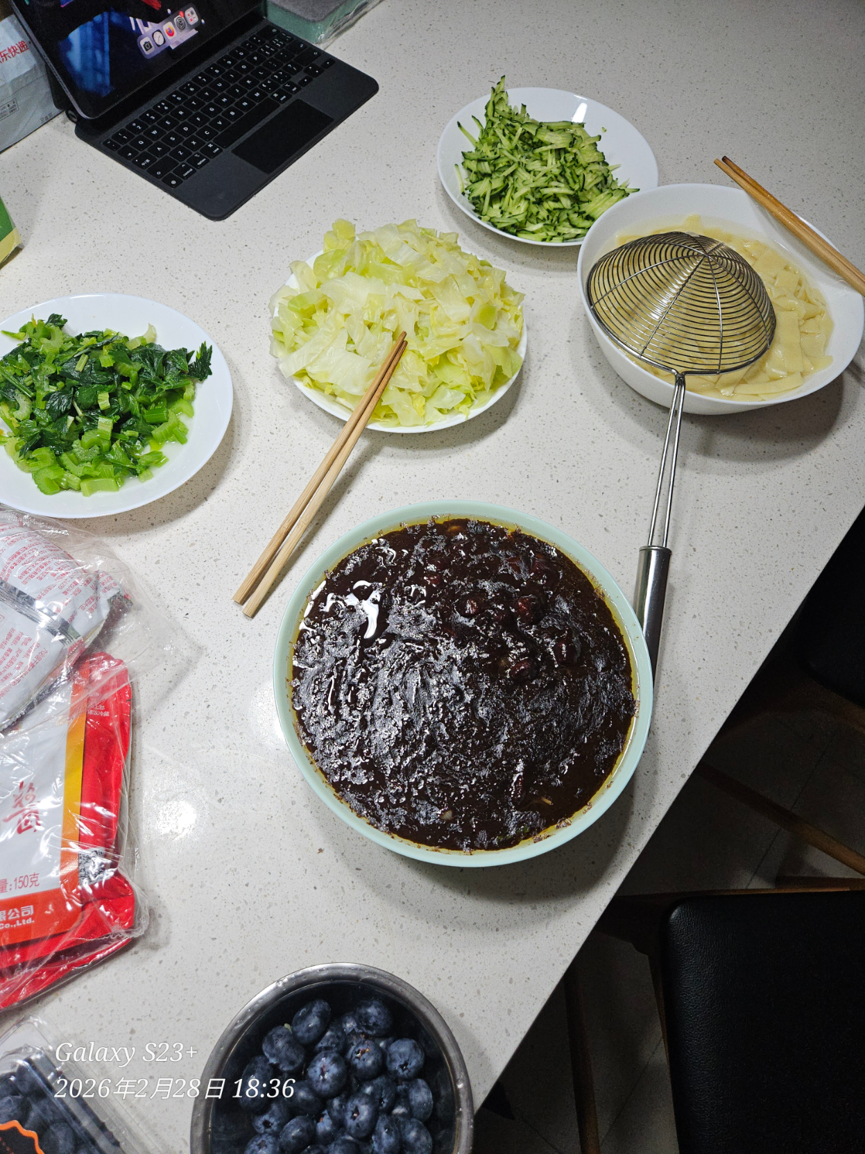 Combined with noodles, you get Zhajiangmian (noodles with fried sauce), along with all the other ingredients, it's really good. I love my cooking skills.