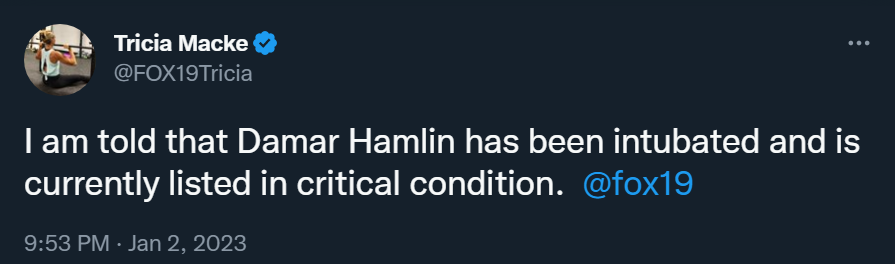 #DamarHamlin of the #BuffaloBills may have just died on live tv. They were doing doing cpr on the field for 10 mins before the ambulance took him away. The made a tackle, got up and then collapsed. They suspended the game. There is no news of his condition either way, though I have to believe if there were any positive news it would have been made known immediately. I hope he regains consciousness.
