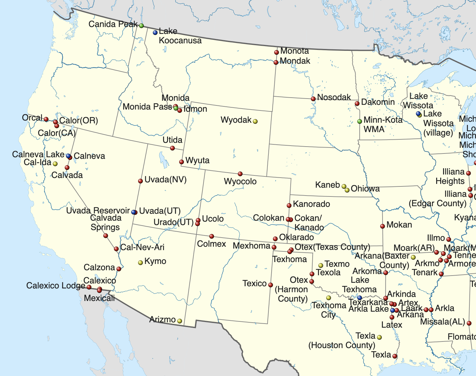 I hope that I can ruin your day by getting you to read this map (courtesy wikipedia) of US town names that are portmanteaus of the two (or sometimes more) states they are near the borders of