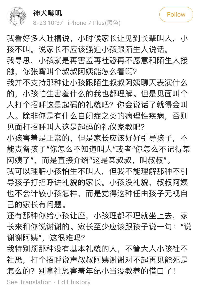 這種傻逼看一眼都嫌多哈。我突然想到,朋友之間介紹新人或者同事引薦是很少扭捏的,而對個體來講社交這件事不會隨着年齡增長轉性,那孩子不願意叫人肯定事出有因。我猜,對小孩講陌生長輩具有天然優勢,叫人,存在一個類似『示弱』的過程,我跟你不熟,但我叫了,這種關係成立了,你便可隨意拿捏我,雖然整體看跟孩子叫不叫沒大關係但拒絕稱呼這個動作是小孩子具有的唯一能動性。還有一點,剛剛想到了,忘了,都怪霧海