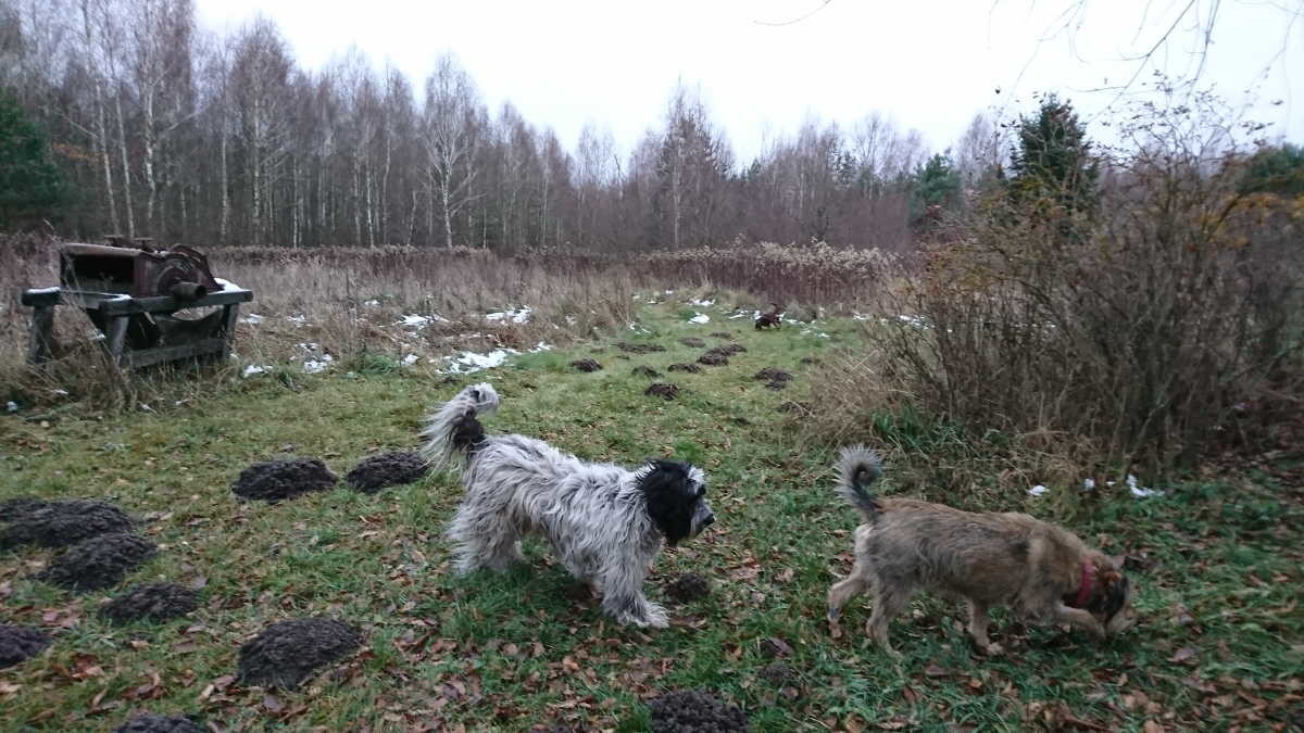 Masza and Bruno inspecting molehills before a walk in the forest with the rest of #IdaPsięta. #DogsOfMastodon