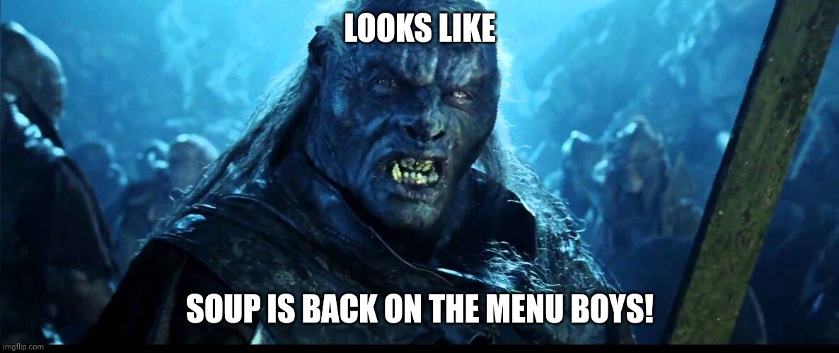 [Can't translate this – "zupa ogrkowa" is a play on "zupa ogórkowa", a soup made from pickled cucumbers, popular in Poland. Real ogre soup looks completely different]