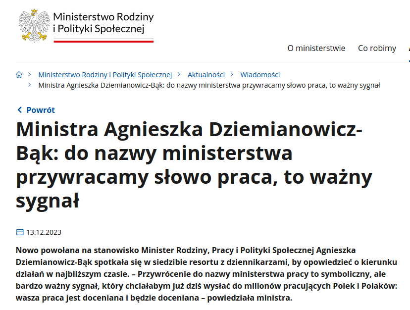 📰 Ministra Agnieszka Dziemianowicz-Bąk: do nazwy ministerstwa przywracamy słowo praca, to ważny sygnał