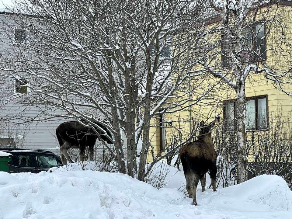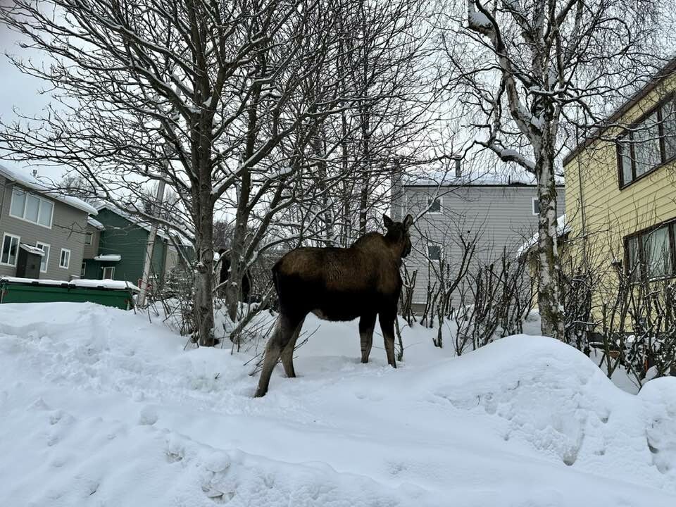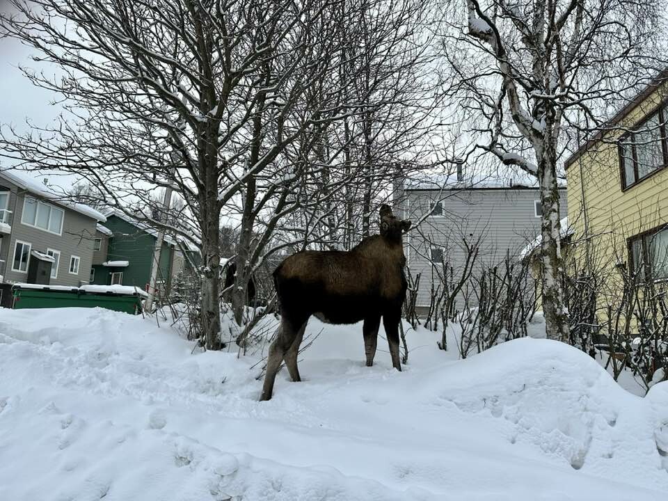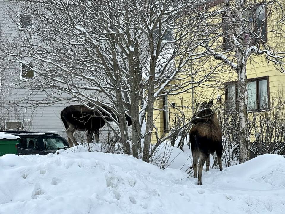 Moose!! We saw two healthy moose in downtown Anchorage, #Alaska this morning munching away on tree limbs.