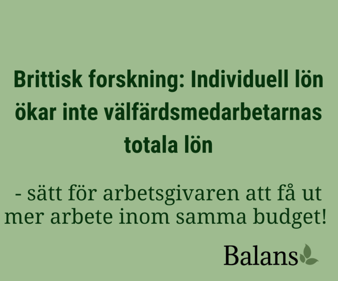 Brittisk forskning: Individuell lön ökar inte välfärdsmedarbetarnas totala lön utan är ett sätt för arbetsgivaren att få ut mer arbete inom samma budget. Individuell lön + effektiviseringskrav = några får mer än andra i lön, alla får mer att göra! tankesmedjanbalans.se/brittisk-for...