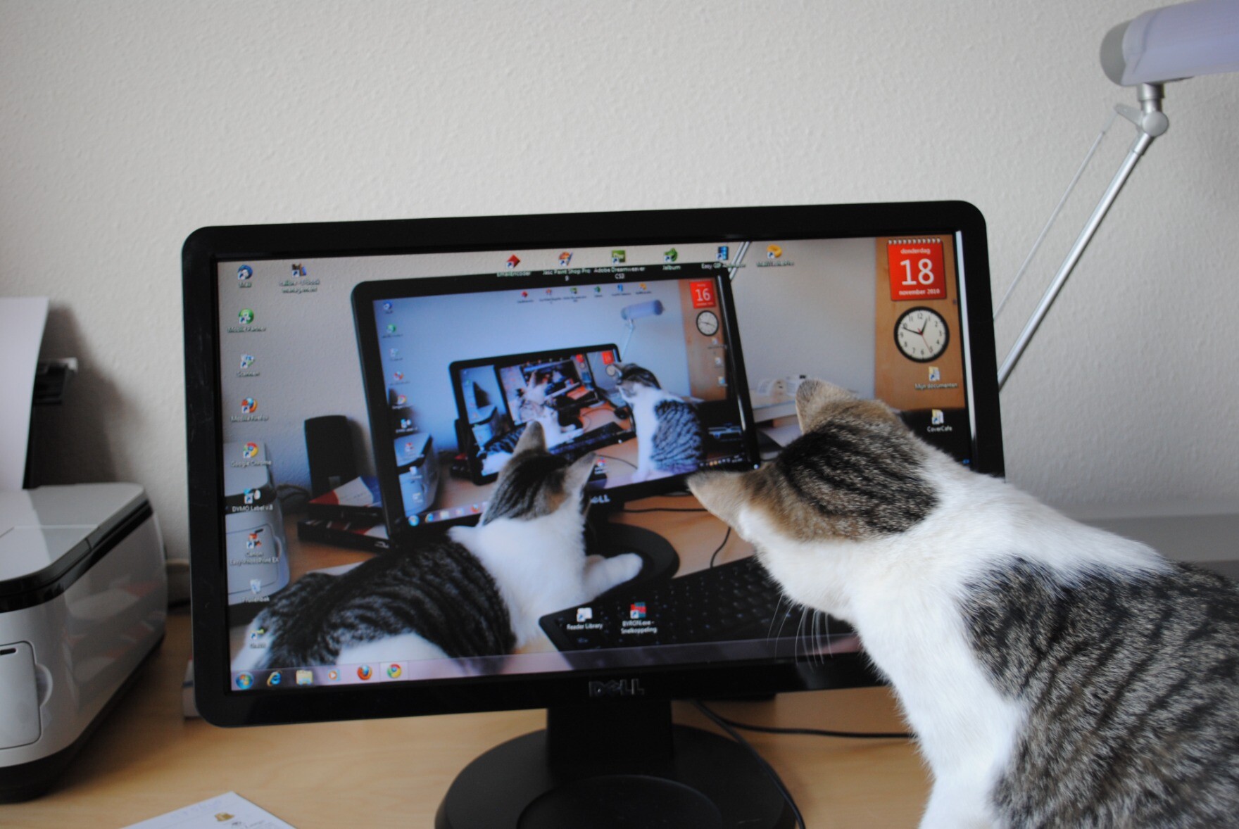 Je maakt een foto van je kat die voor je beeldscherm zit. Die foto installeer je als wallpaper. Dan maak je weer een foto van je kat etc. etc. etc. En dan krijg je na verloop van tijd dit.