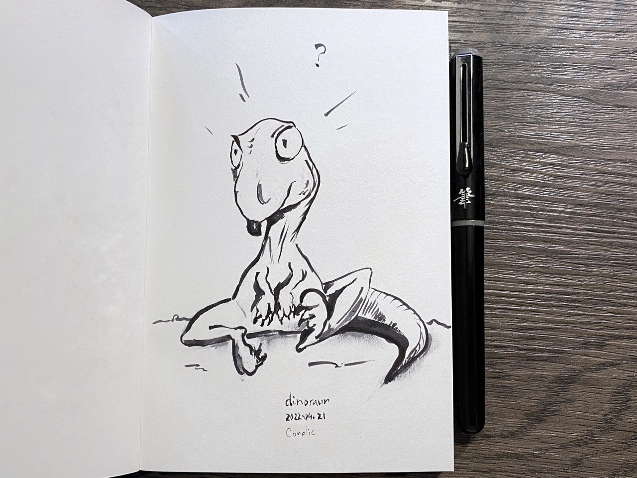15-minute sketch in dark grey ink of a goofy baby t-rex caught with the tongue out!
