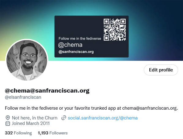 What my dormant #Twitter profile looks like right now. No overt promotion of any banned social media platform, only links to my own instance and my own personal address on my own instance on the #fediverse.
