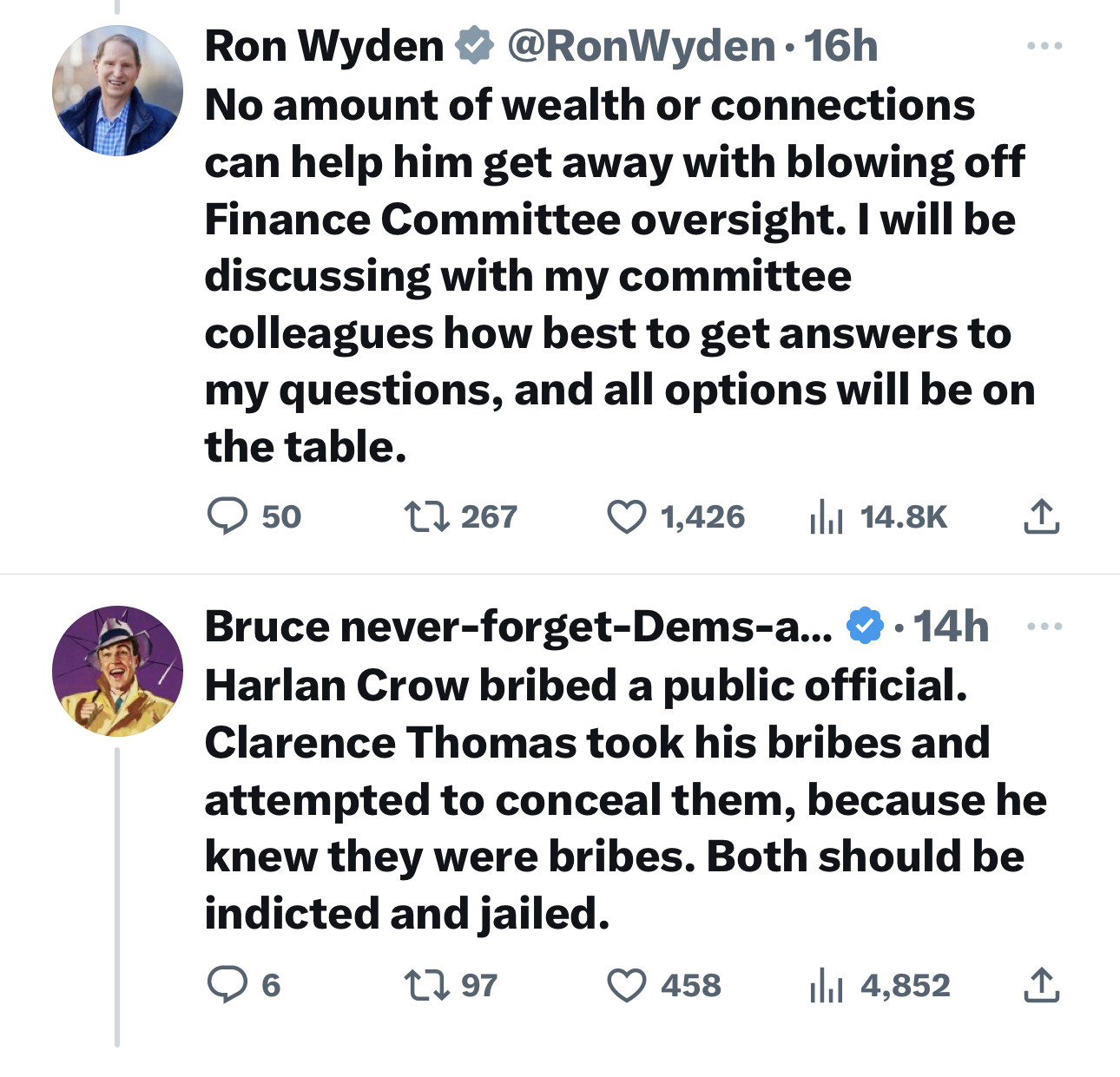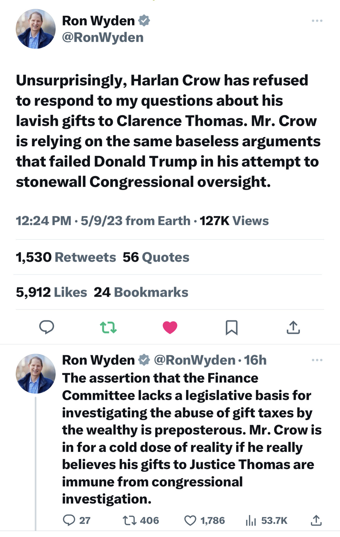 Wyden has previously said he would “explore using other tools at the committee’s disposal” should Crow not cooperate with the request. @politico politico.com/news/2023/05/09/h #HarlanCrow #ClarenceThomas #scotus